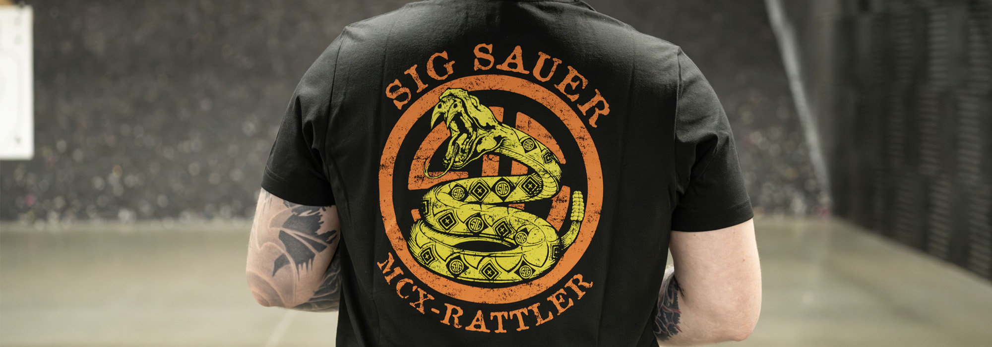 One of SIG SAUER's many historical achievements, the MCX-RATTLER is now available in this unique t-shirt design. The front of the t-shirt showcases a simple design featuring both the SIG SAUER and 5.11 logos, while the back displays a prominent rattlesnake, symbolizing the willingness to stand your ground. Whether you're heading to the range, going out on the town, or enjoying a leisurely lifestyle, this shirt is suitable for any occasion. Made from premium materials, it offers both comfort and a great fit.
