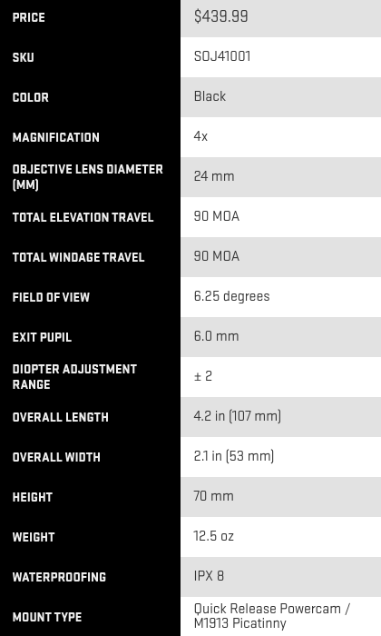 The JULIET4 4x Magnifier is designed to work as a stand-alone magnification solution or in conjunction with reflex optics. This family of magnifiers is an excellent choice for transitioning from close quarters to intermediate ranged targets. In conjunction with a reflex optic, the JULIET4 can be adjusted for height through the use of spacers. It has a PowerCam 90° Mount so it can be quickly flipped to the side for more immediate, close quarters scenarios or deployed rapidly to bring targets four times closer. Its quick release mount comes with built-in recoil lugs for repeatable zero. The JULIET4 has a front and rear thread-in lens protector to keep it secure from the elements.