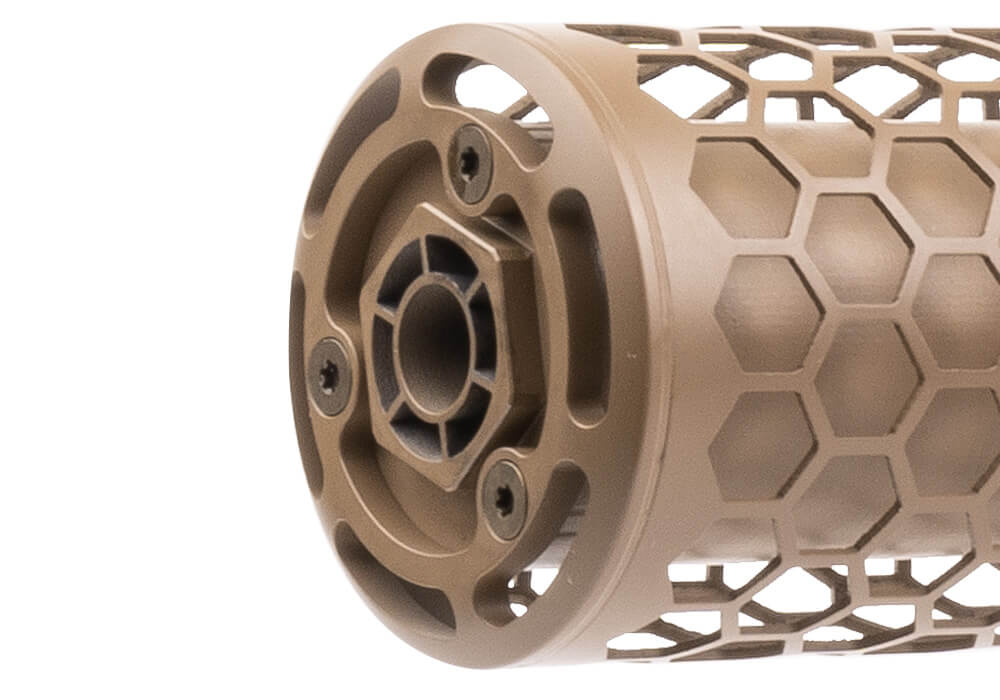 The direct thread suppressor is shielded by a detachable titanium hexagonal heat shield lowering the system’s thermal signature and increasing maneuverability. The shield was specifically designed to reduce the likelihood contact of burns when in dynamic situations and accommodate rapid transport in mission critical scenarios.
